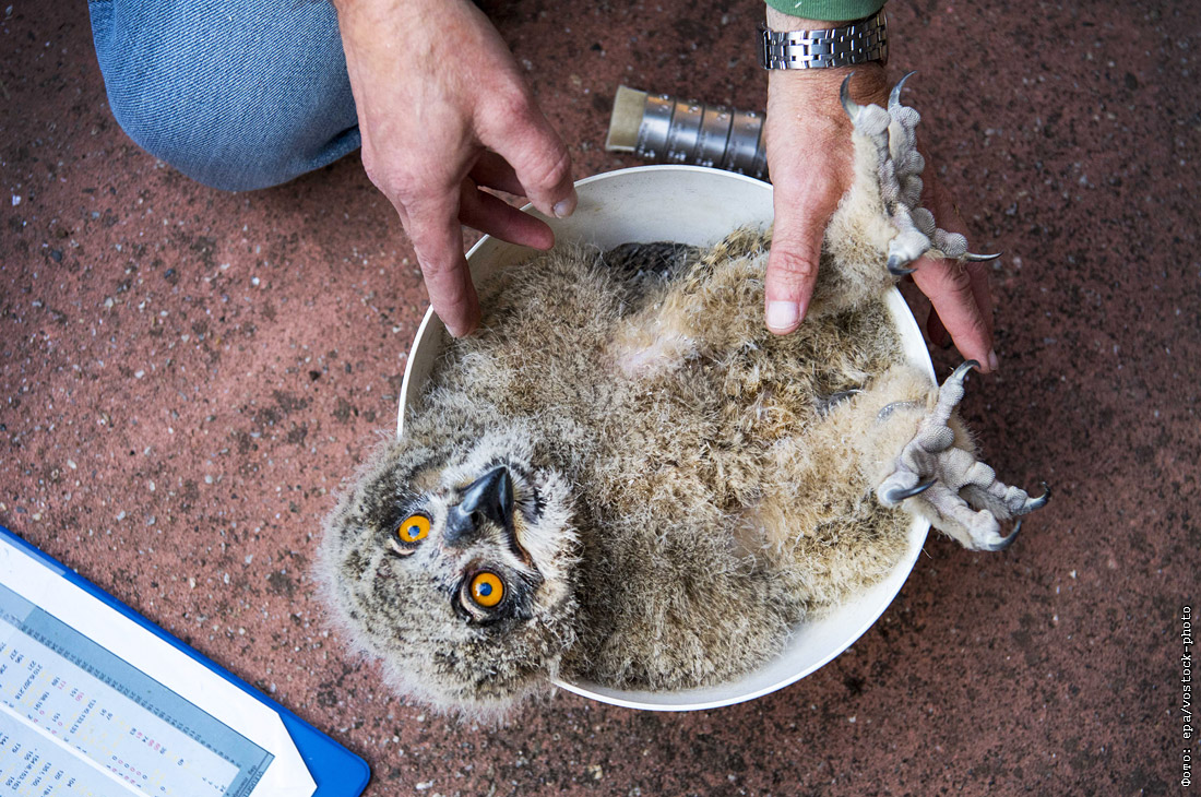 Взвешивание совенка в зоопарке Арнема. Нидерланды.