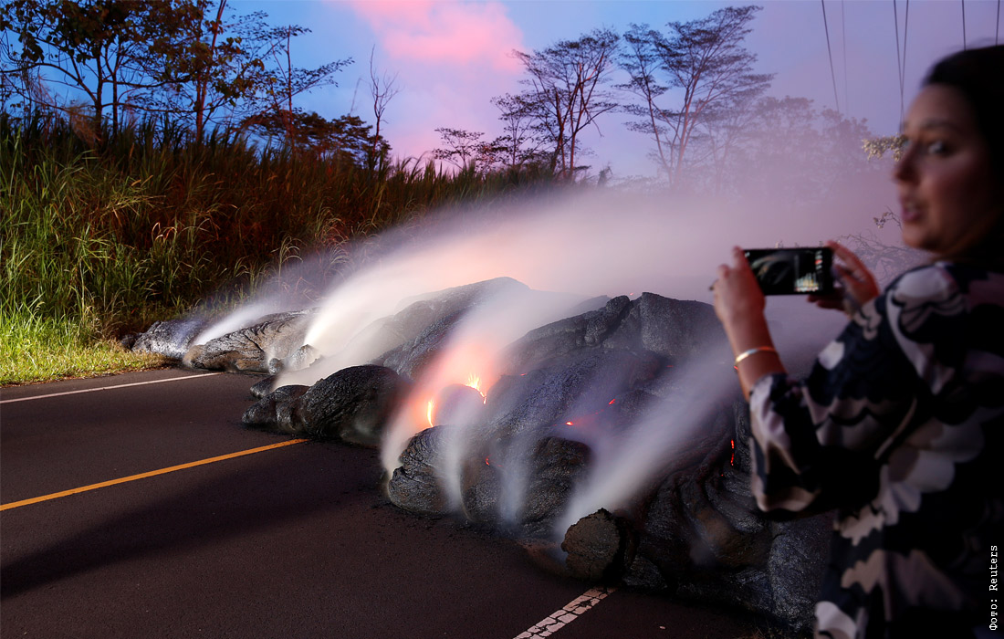 Четвертую неделю продолжается извержение вулкана Килауэа на Гавайях. Лава, медленно сжигающая все на своем пути, в ближайшее время может перекрыть единственную наземную дорогу, по которой могут эвакуироваться местные жители. Килауэа считается одним из самых активных действующих вулканов в мире.