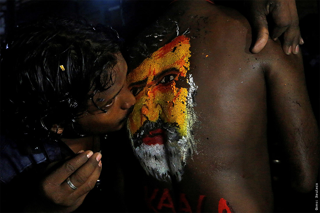 В Индии выходит новый фильм с Раджникантом, в честь премьеры поклонники творчества артиста рисуют на своих спинах его портреты, а потом целуют их. Такая любовь к кино.