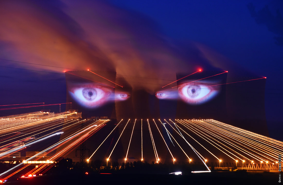 Видеоинсталляция чешского художника Милана Каиса Big Night Watchman на градирнях АЭС Темелин в Чехии