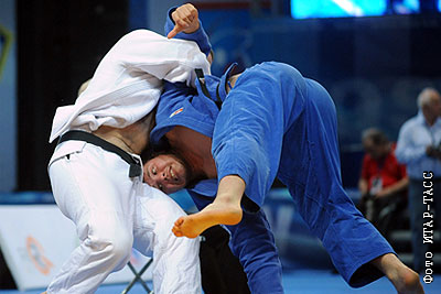 Россиянин Александр Михайлин (в белой форме), завоевавший "золото", и польский спортсмен Януш Волжнарович (в синей форме) в полуфинальном бое в весовой категории свыше 100 кг на соревнованиях по дзюдо второго этапа "Большого шлема"