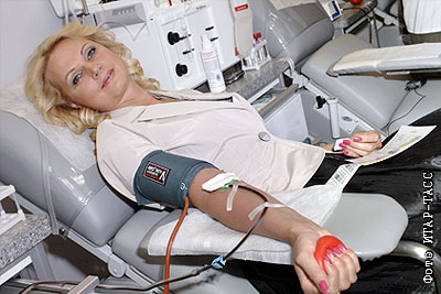 Министр здравоохранения и социального развития РФ Татьяна Голикова во время сдачи крови в мобильном комплексе переливания крови Федерального медико-биологического агентства