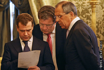 Президент РФ Дмитрий Медведев, Заместитель председателя Правительства РФ, министр финансов РФ Алексей Кудрин и глава МИД России Сергей Лавров (слева направо) перед началом встречи в рамках саммита ОДКБ в Кремле