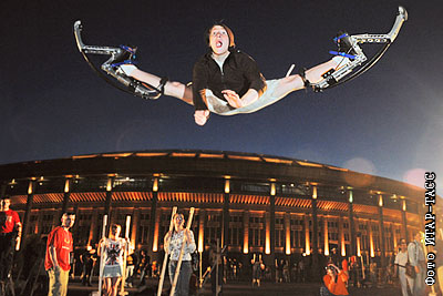 Участники шествия ходулистов, посвященного 25-летию Цирка дю Солей (Cirque du Soleil), в Лужниках