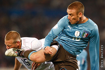 Итальянец Даниеле де Росси (справа) и американец Джей Демерит (слева) во время футбольного матча в Претории