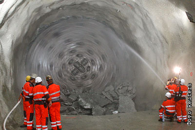 Проходческий щит "Gaby" на завершающей стадии буровых работ на участке Ерстфелд-Амстег самого длинного железнодорожного тоннеля в мире (57 км), проходящего под Альпами