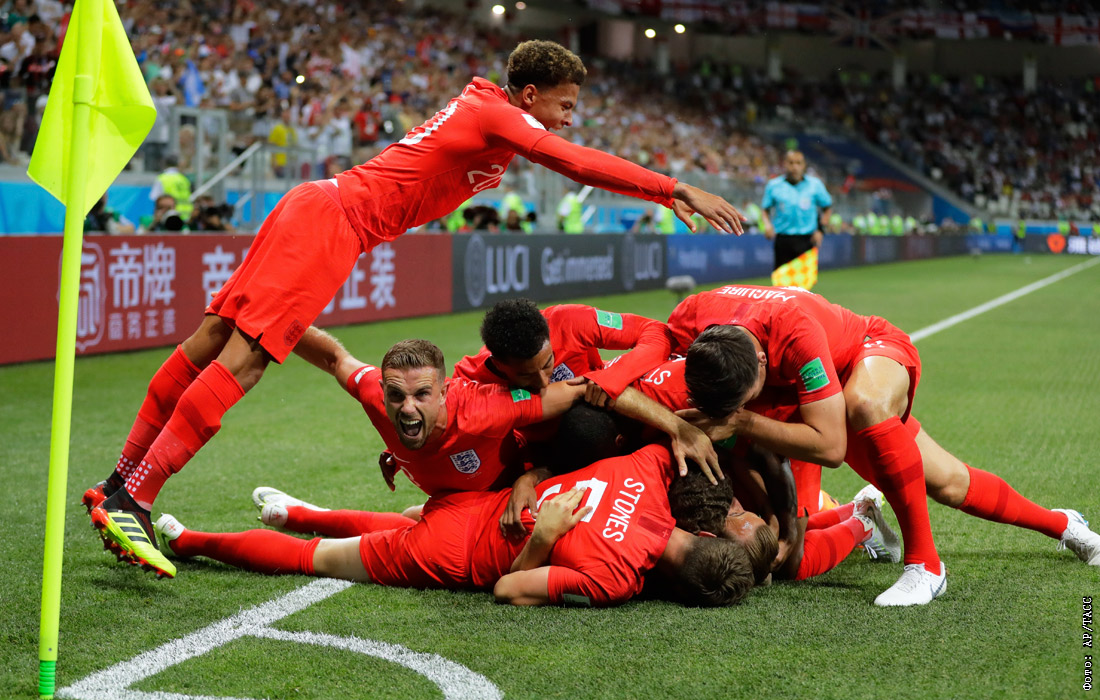Игроки сборной Англии радуются первому забитому голу в матче группового этапа чемпионата мира по футболу против Туниса