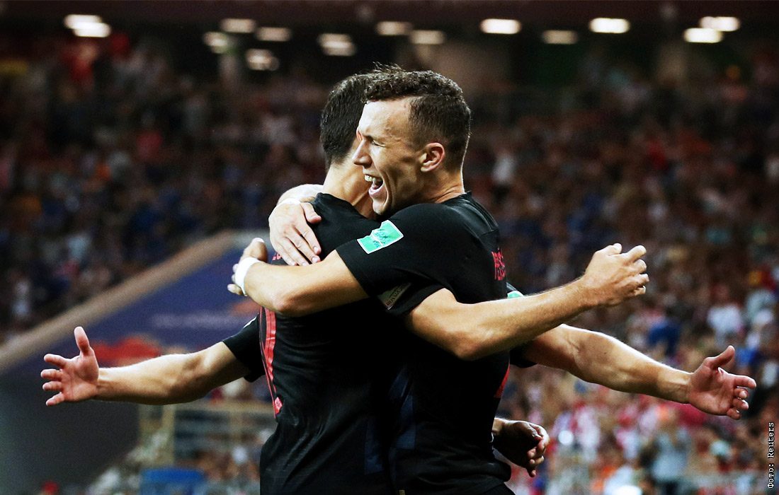 Хорватские футболисты Иван Перишич и Йосип Пиварич празднуют гол в матче чемпионата мира против Исландии
