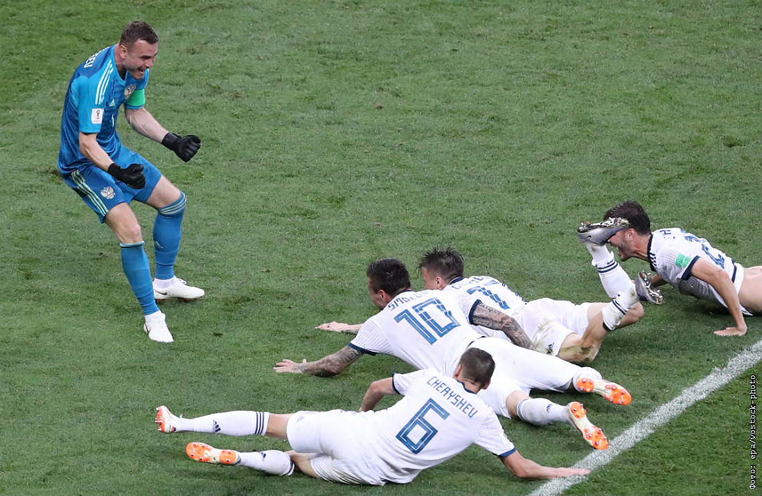 Российская команда победила Испанию в серии пенальти в матче 1/8 финала домашнего ЧМ по футболу. Основное и дополнительное время матча закончилось вничью 1:1. Игорь Акинфеев отразил два пенальти в серии послематчевых одиннадцатиметровых.