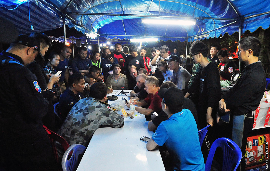 Международная команда добровольцев-спасателей у пещеры Кхао Луанг, где 23 июня из-за сильного ливня потерялась футбольная команда из 12 школьников