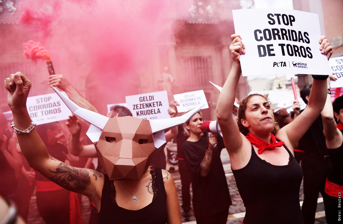 Акция протеста зоозащитников в преддверии фестиваля Сан-Фермин в испанской Памплоне. Активисты выступают против издевательства над быками и убийства животных во время боев.
