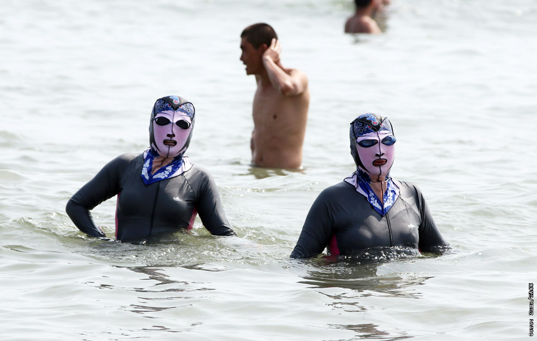 Пляжный отдых на побережье Желтого моря в китайском Циндао. Отдыхающие надевают резиновые маски с прорезями для глаз, рта и носа, защищающие кожу от солнечных лучей.