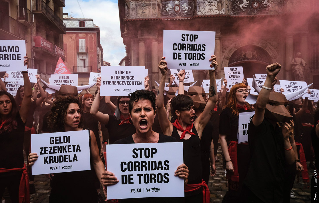 Каждый год перед фестивалем зоозащитники устраивают акции протеста против издевательства над быками и убийства животных во время боев