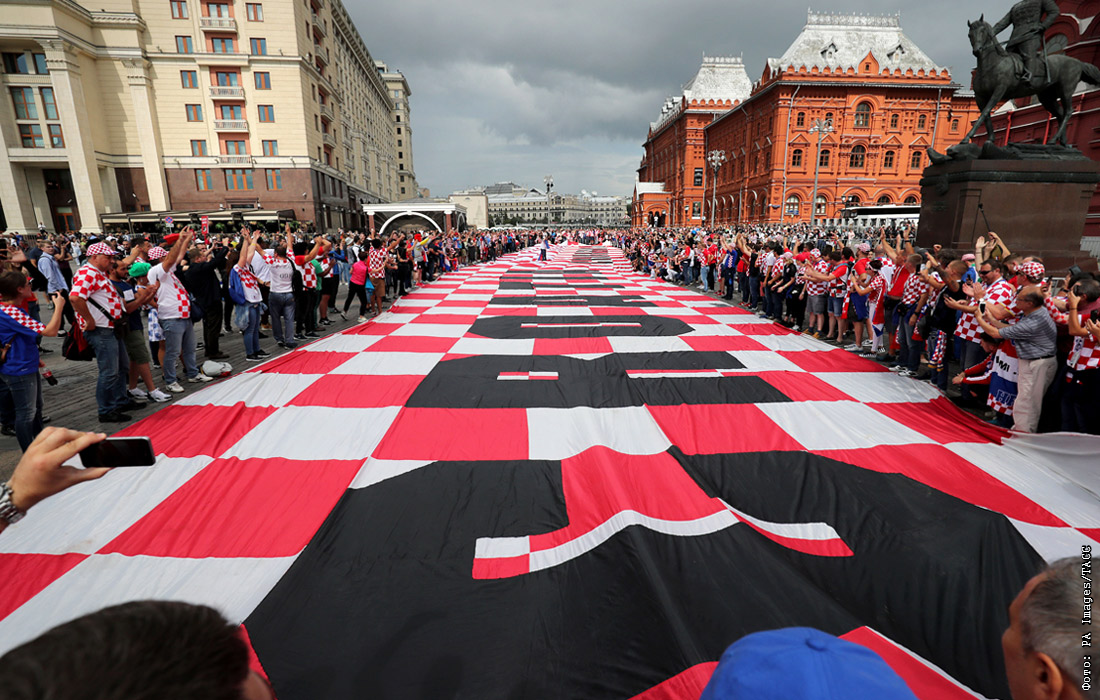 Футбольные болельщики из Хорватии развернули в центре Москвы огромный флаг в красно-белую клетку, как на гербе их страны, в преддверии полуфинала чемпионата мира по футболу между сборными Хорватии и Англии