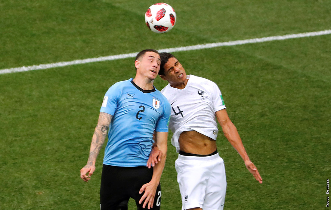Уругвайский футболист Хосе Мария Хименес и француз Рафаэль Варан в матче 1/4 финала (Франция победила - 2:0)