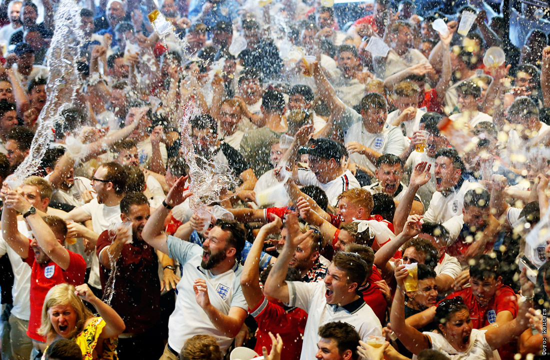 Английские болельщики празднуют выход своей команды в полуфинал чемпионата мира после победы над Колумбией в серии пенальти