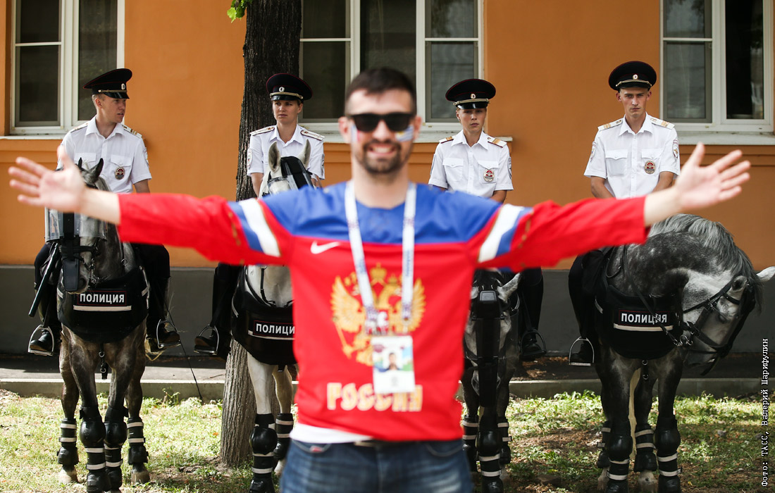 Болельщик и сотрудники конной полиции в Нижнем Новогороде