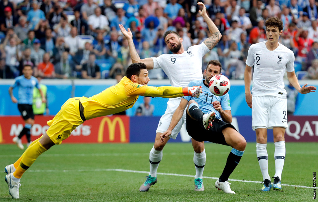 Вратарь сборной Франции Уго Льорис (слева) во время матча 1/4 финала против Уругвая (2:0)