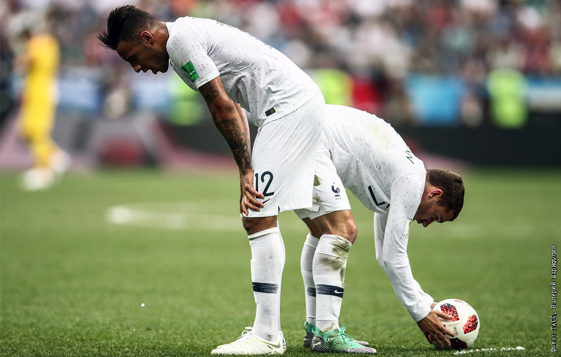 Игроки сборной Франции Корентен Толиссо и Антуан Гризманн (слева направо) в матче 1/4 финала против Уругвая (2:0)