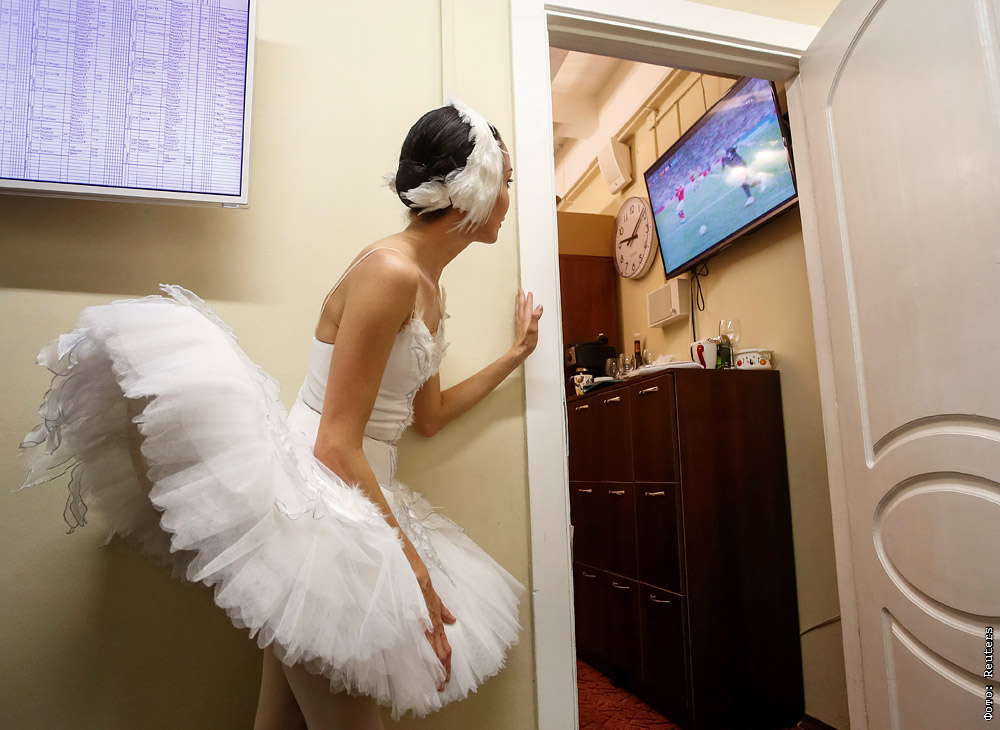 Балерина наблюдает за трансляцией четвертьфинального матча Кубка мира между Россией и Хорватией в Михайловском театре
