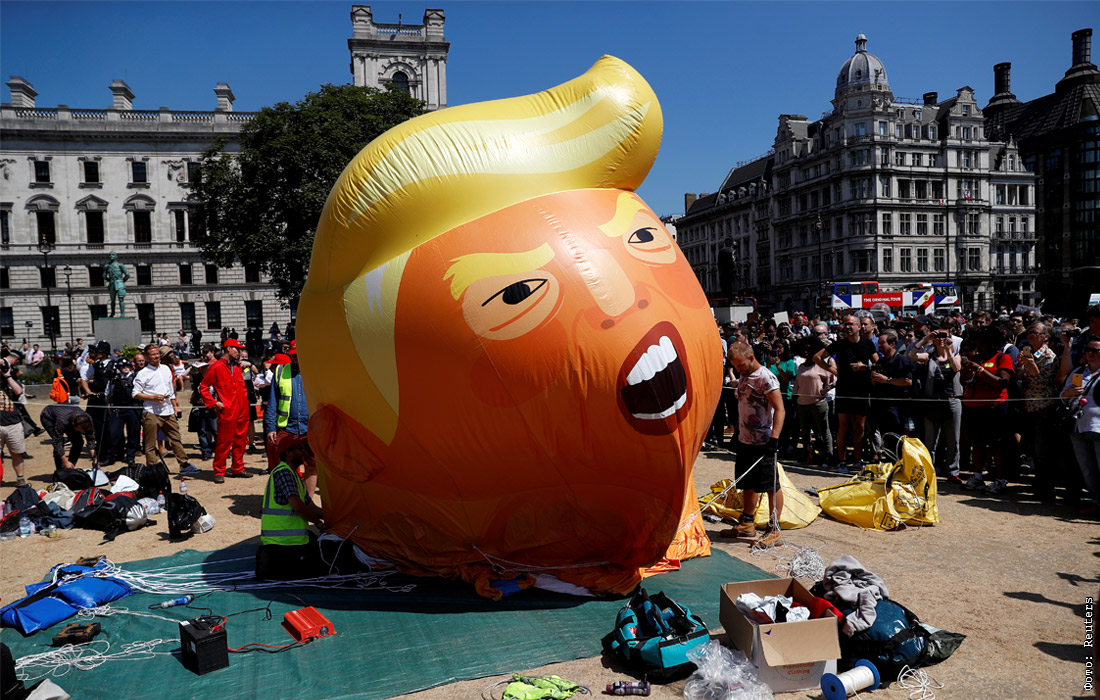 Британские активисты, протестующие против визита президента США Дональда Трампа в страну, запустили в воздух над Лондоном гигантский надувной шар, на котором американский лидер изображен в образе младенца в подгузнике и со смартфоном в руке