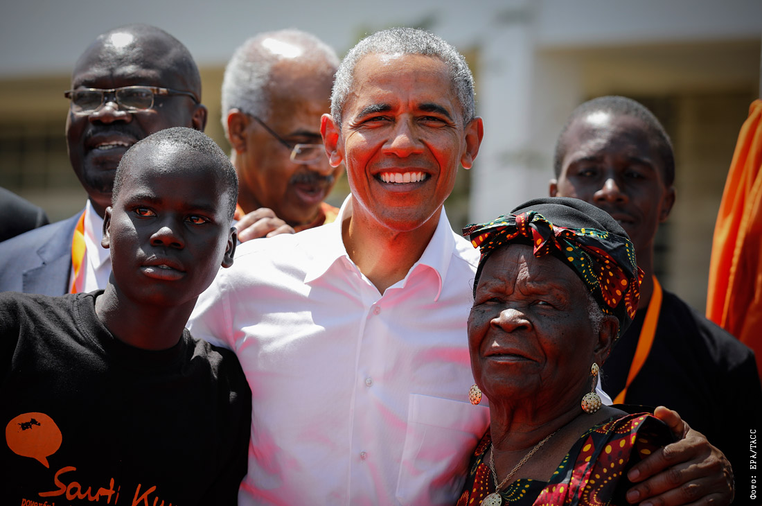 Бывший президент США Барак Обама с приемной бабушкой Сарой на открытии спортивно-тренировочного центра для детей Sauti Kuu в Кении