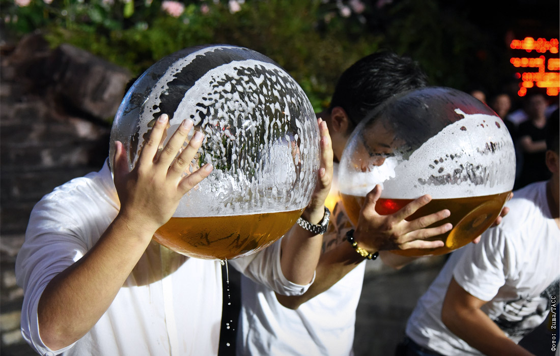 Соревнования по скоростному выпиванию пива из аквариумов в китайской провинции Чжэцзян