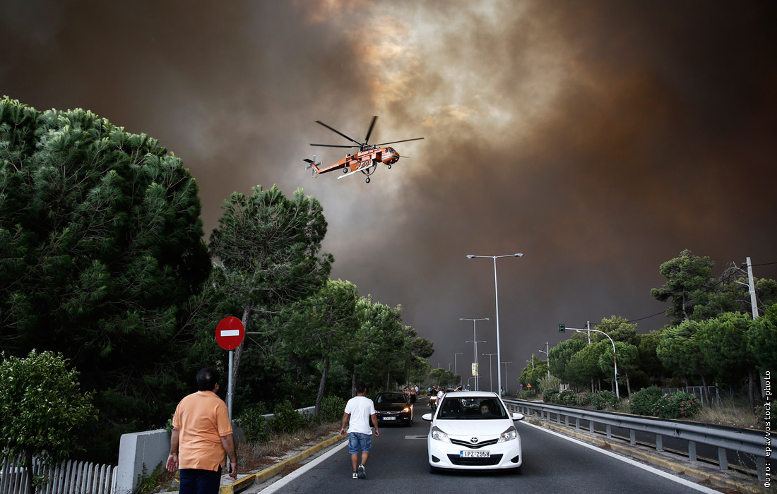 Два крупных пожара бушуют в западном и восточном пригородах Афин. Горят сосновые леса, огонь быстро распространяется благодаря сильному ветру; его скорость достигает 80 км в час. По меньшей мере 50 человек стали жертвами пожаров, более ста человек получили ожоги и травмы.