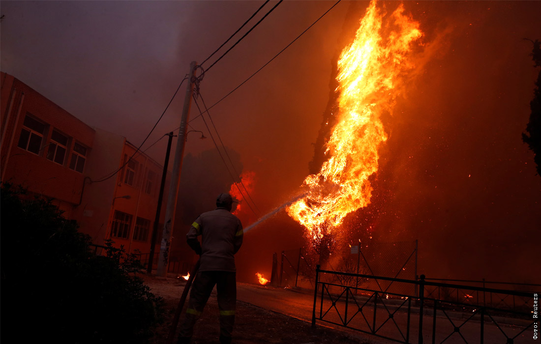 Два крупных пожара бушуют в западном и восточном пригородах Афин. Горят сосновые леса, огонь быстро распространяется благодаря сильному ветру; его скорость достигает 80 км в час. По меньшей мере 50 человек стали жертвами пожаров, более ста человек получили ожоги и травмы.