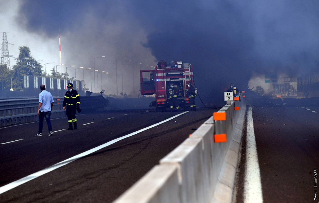 Мощный взрыв произошел близ аэропорта итальянского города Болонья. В результате происшествия один человек погиб и 65 пострадали. Взрыв произошел после аварии с участием грузового автомобиля, который, вероятно, перевозил горючие вещества.