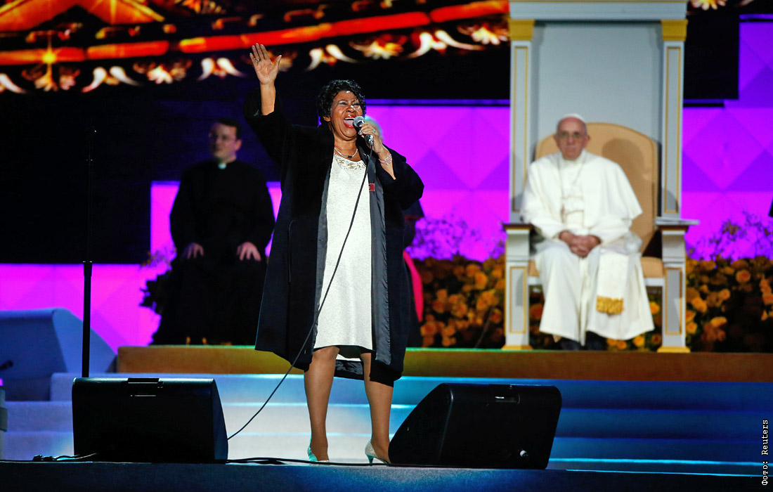 Арета Франклин выступает перед папой римским Франциском во время саммита, посвященного вопросам семьи, в Филадельфии. 2015 год.