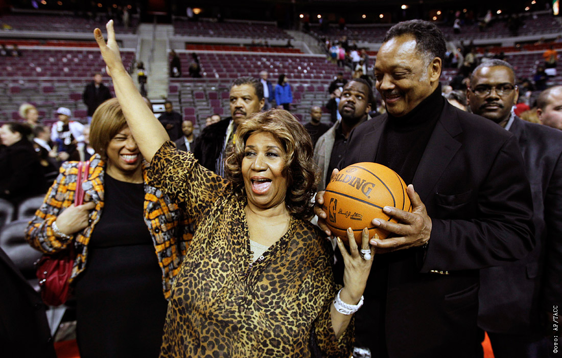Арета Франклин и проповедник Джесси Джексон на баскетбольном матче в Мичигане. 2011 год.