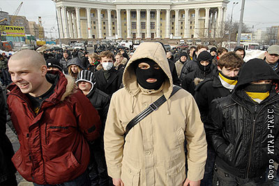 Участники митинга в память о псковских десантниках, погибших в Чеченской республике, организованного активистами националистического "Славянского союза" и Движения противодействия нелегальной иммиграции на Суворовской площади