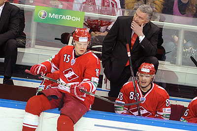 Главный тренер ХК "Спартак" Милош Ржига (в центре) на матче чемпионата КХЛ: "Спартак" (Москва) – "Ак Барс" (Казань)