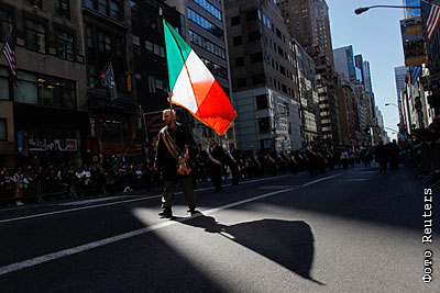 Человек несет ирландский флаг во время парада Дня святого Патрика в Нью-Йорке