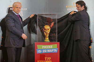Президент РФС Сергей Фурсенко и региональный менеджер компании Coca Cola в России Любо Груич (слева направо) на презентации Кубка Мира ФИФА в аэропорту "Пулково"
