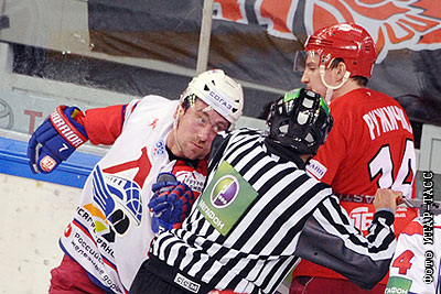 Игрок "Локомотива" Александр Гуськов (слева) и спартаковец Штефан Ружичка (справа) в четвертьфинальном матче чемпионата КХЛ: "Спартак" - "Локомотив" (Ярославль)