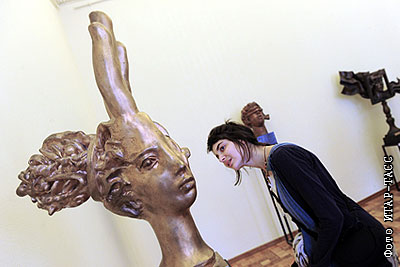 Посетительница у работы "Крик" (1990-е) скульптора Александра Бурганова на выставке, посвященной его 75-летнему юбилею, в Российской академии художеств