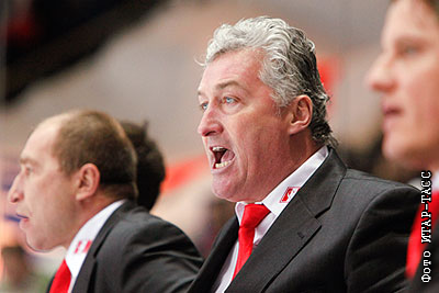 Главный тренер "Спартака" Милош Ржига (в центре) на четвертьфинальном матче чемпионата КХЛ: "Локомотив" (Ярославль) - "Спартак" (Москва) - 2:1