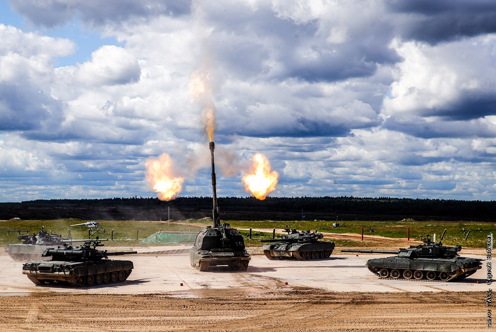 Танки Т-80У и самоходная артиллерийская установка "Мста-С" (в центре) во время динамического показа военной техники в рамках IV Международного военно-технического форума "Армия-2018" в парке "Патриот"