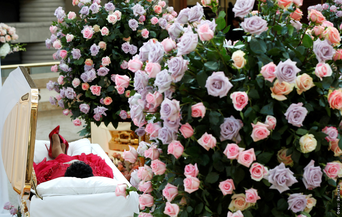 Позолоченный гроб с телом легендарной певицы Ареты Франклин установили в Музее истории афроамериканцев Чарльза Райта в Детройте, чтобы поклонники могли попрощаться с артисткой. Американская певица скончалась 16 августа в возрасте 76 лет после продолжительной болезни.