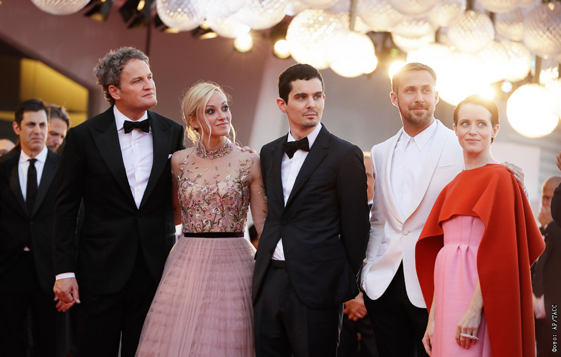 Съемочная группа фильма "Человек на Луне" (актеры Джейсон Кларк, Оливия Гамильтон, режиссер Дэмьен Шазелл, актеры Райан Гослинг и Клэр Фой)