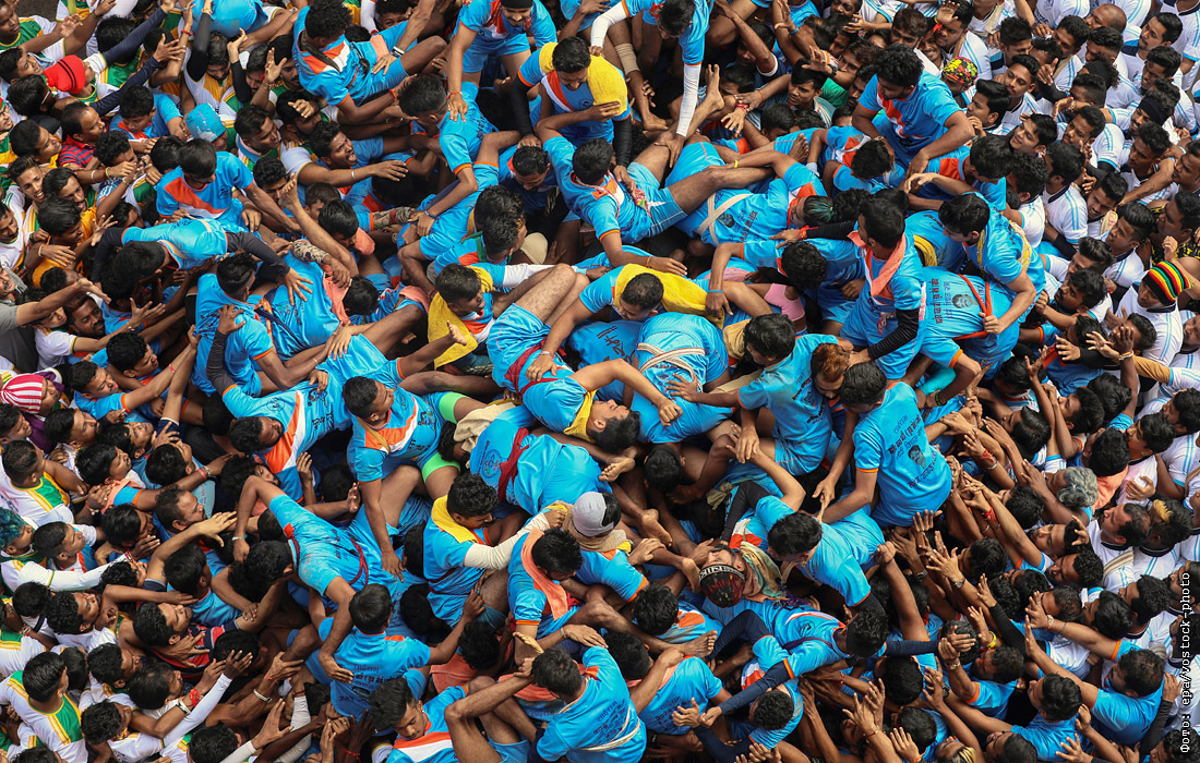 Формирование человеческой пирамиды на фестивале Джанмаштами в Мумбаи, который празднует рождение индуистского бога Кришны