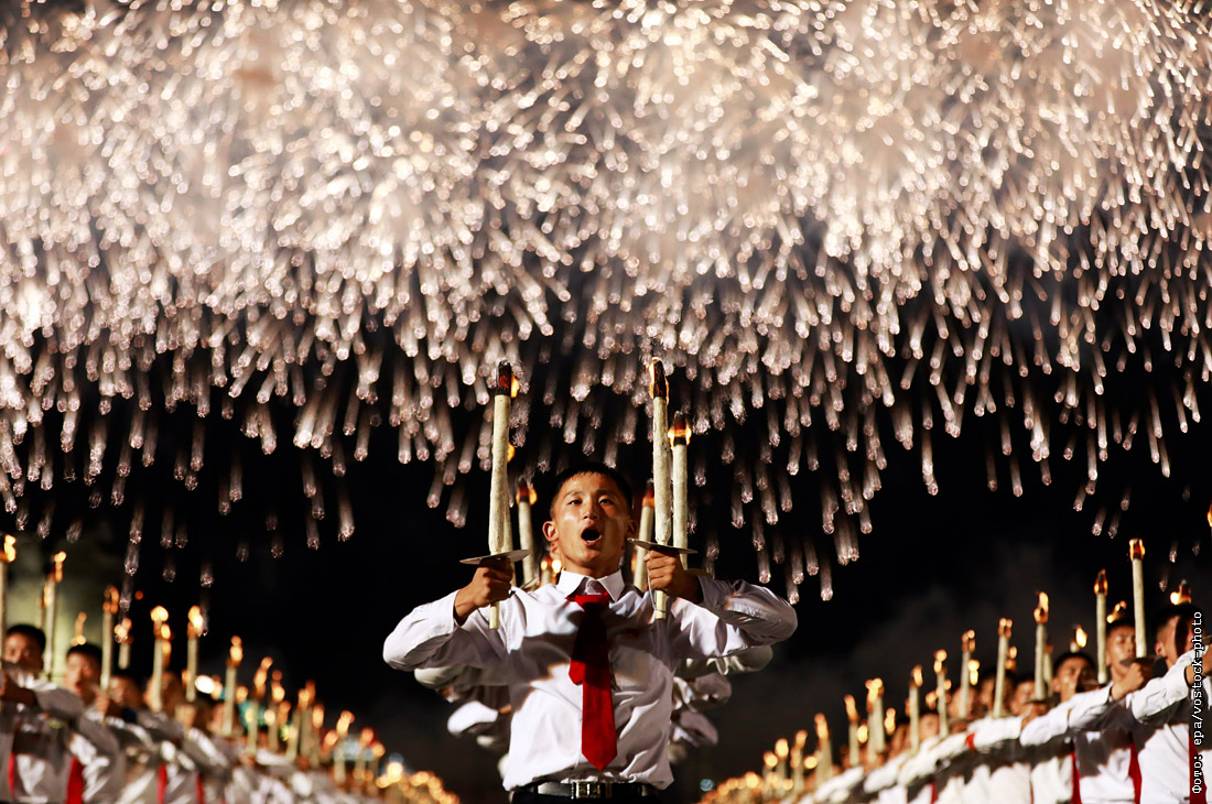 Факельное шествие молодежи на площади имени Ким Ир Сена в Пхеньяне в честь 70-летия образования республики