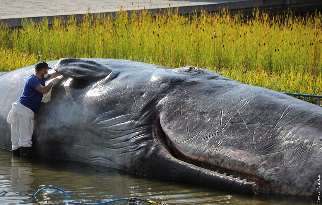 Инсталляция в виде кита, выброшенного на берег, появилась вдоль берега реки Мансанарес в Мадриде. Таким образом участники художественного коллектива "Капитан Бумер" из Бельгии хотят привлечь внимание к проблемам окружающей среды.
