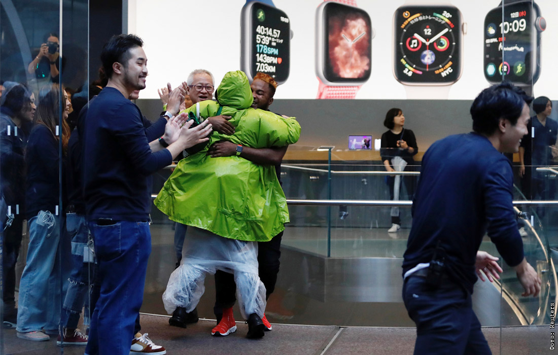 Работники магазина в Токио приветствуют первых покупателей нового iPhone XS