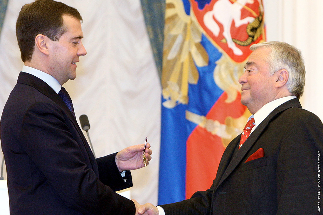 Президент России Дмитрий Медведев и артист Московского театра миниатюр Роман Карцев, награжденный орденом "За заслуги перед Отечеством" IV степени, на торжественной церемонии вручения государственных наград в Екатерининском зале Кремля. Ноябрь 2009 года.