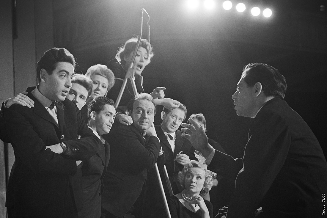 Репетиция в Ленинградском театре миниатюр. Справа Аркадий Райкин, третий слева Роман Карцев, 1963 год.