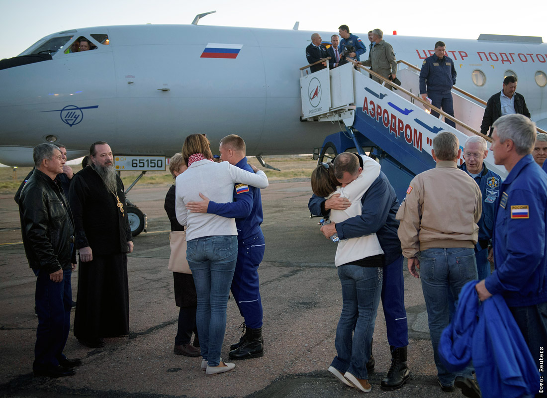 Члены основного экипажа МКС-57/58 космонавт Роскосмоса Алексей Овчинин и астронавт НАСА Ник Хейг во время встречи с родственниками в аэропорту Байконура. Во время запуска ракеты-носителя "Союз-ФГ" с кораблем "Союз МС-10" с космодрома произошла нештатная ситуация, экипаж пилотируемого корабля совершил аварийную посадку в степи Казахстана.