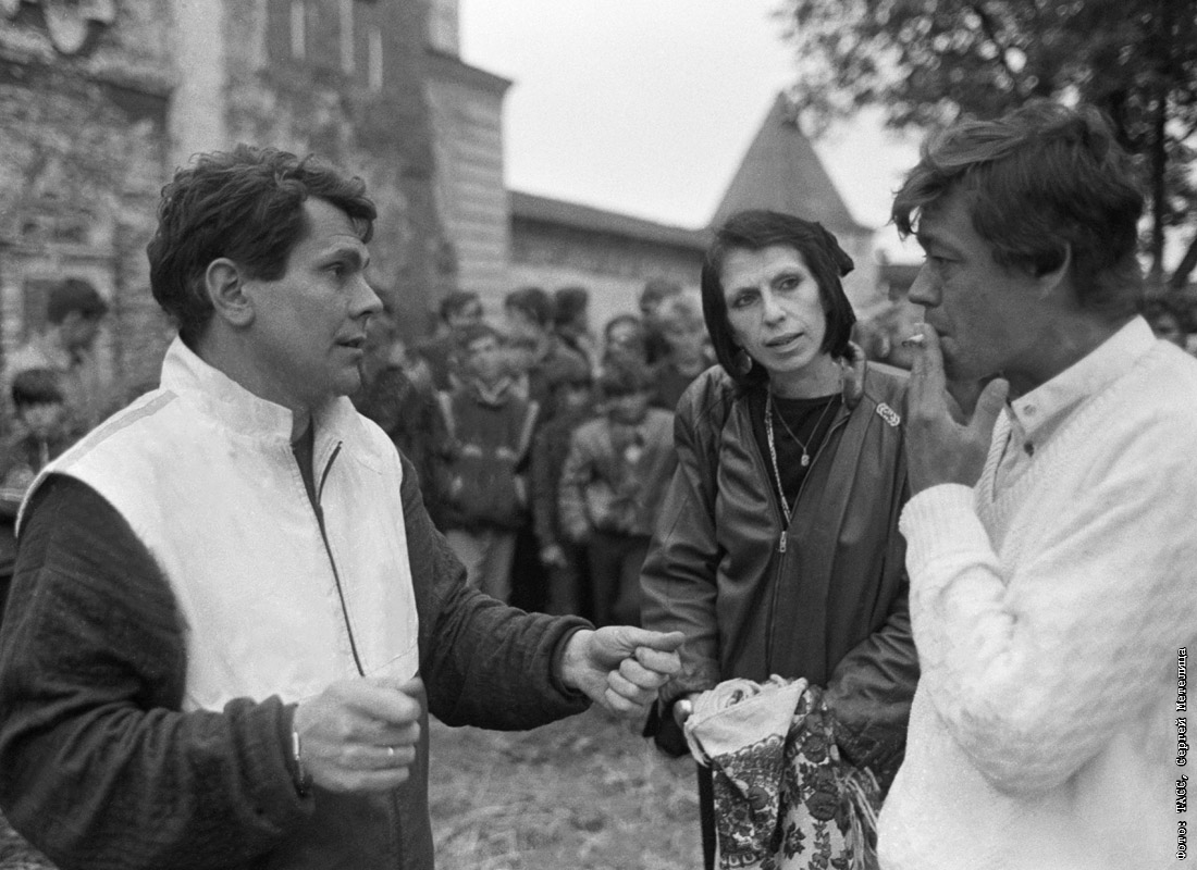 Кинорежиссер Юрис Подниекс (слева), английский продюсер Вероника Боднарк и Николай Караченцов во время обсуждения съемок в Никитской слободе. Август 1987 года.